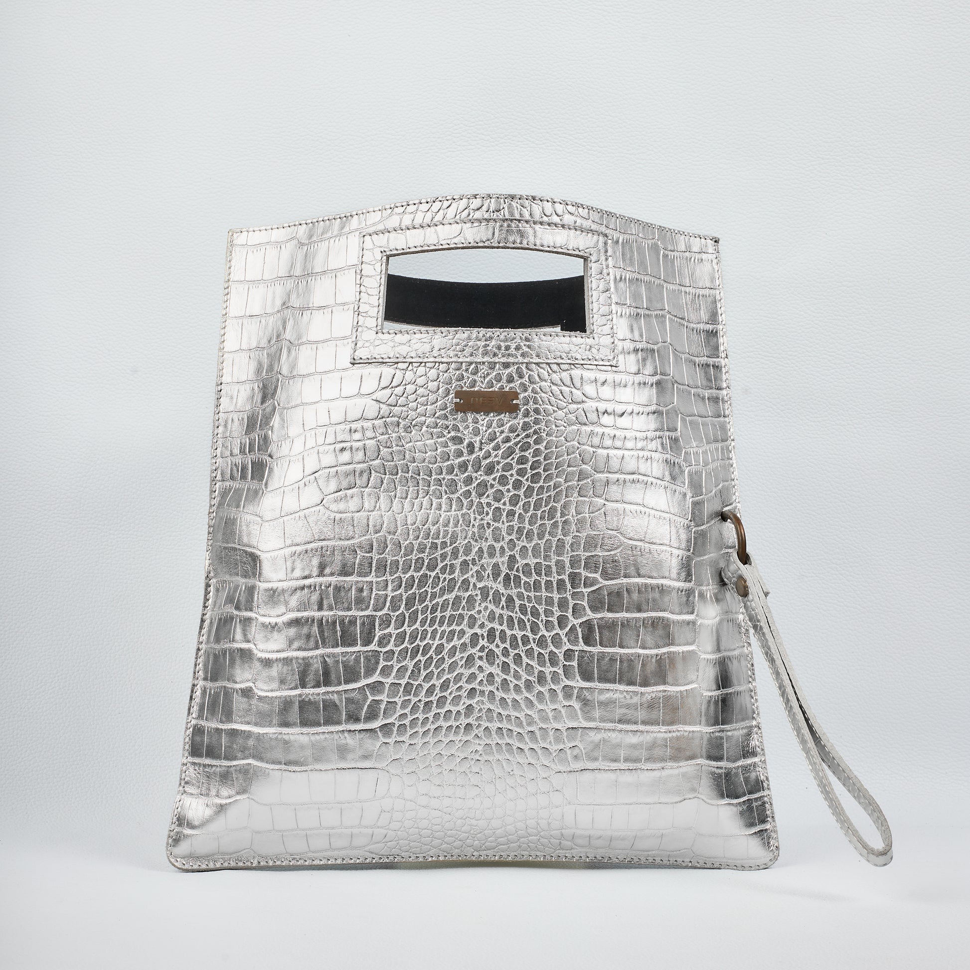 Worn closed, it becomes a slim architectural clutch with a clean cut-out handle. Open it up to reveal a longer silhouette for added presence and space. For hands-free elegance, the leather side handle offers a secure wristlet-style carry.